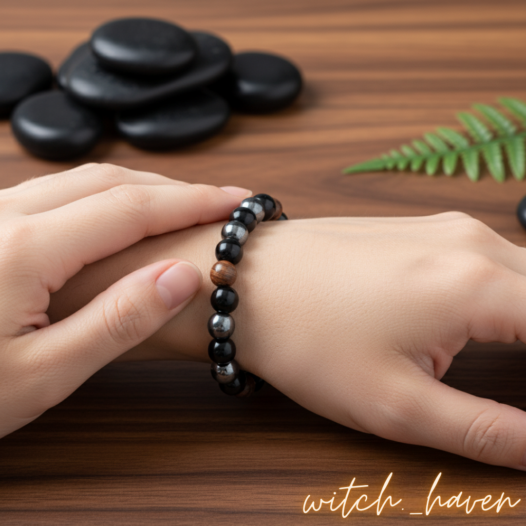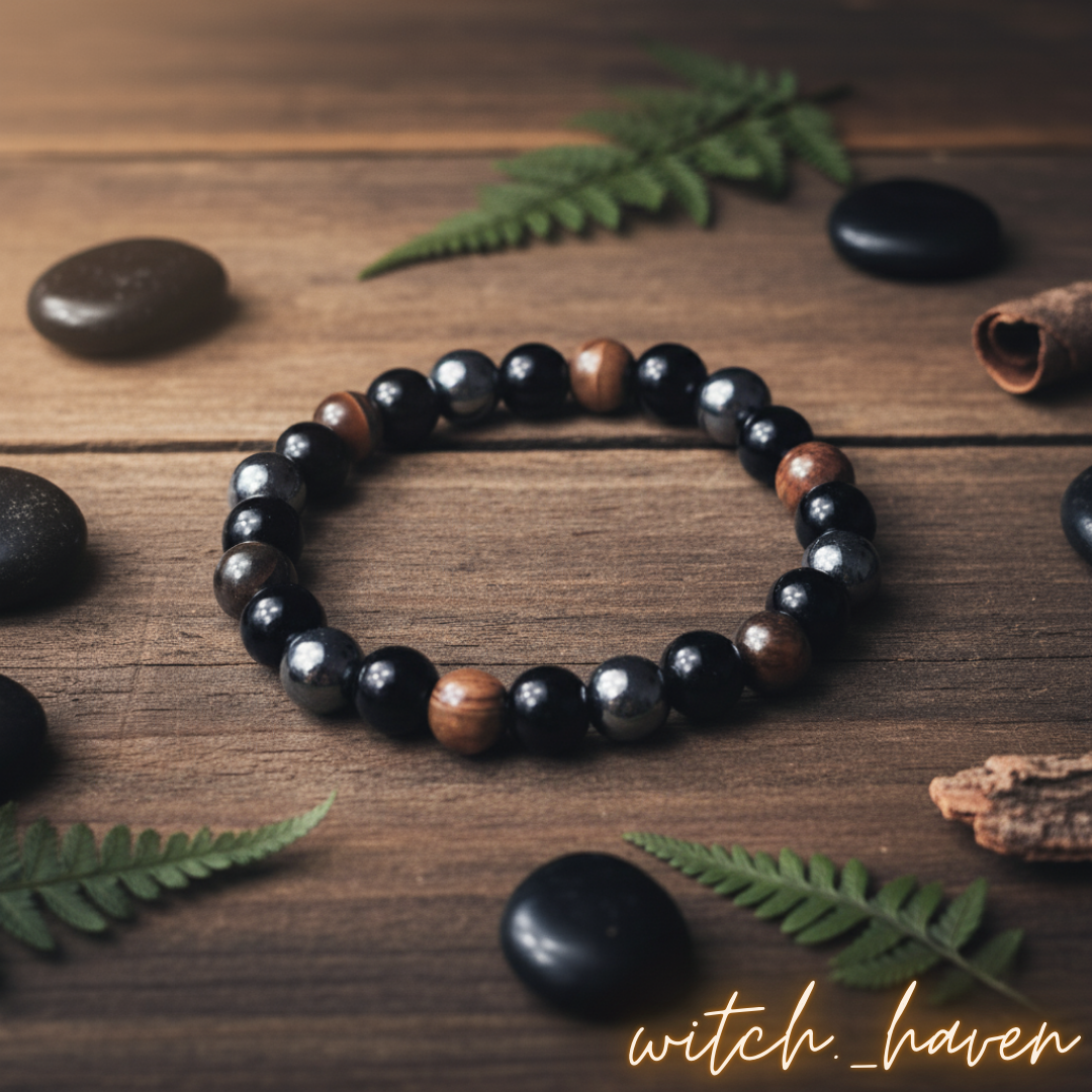 In meinem kleinen Atelier fertige ich jedes Schmuckstück persönlich für dich an. Dieses Dreifach Schutz Armband ist eine wahre Herzenssache für mich. Ich kombiniere dabei die reine Kraft der Natur mit achtsamer Handwerkskunst, damit es nicht nur äußerlich schön ist, sondern dich auch auf tieferer Ebene berührt. Jede einzelne Perle wähle ich sorgfältig aus und reihe sie auf ein hochwertiges Elastikband, um dir den perfekten Tragekomfort zu bieten. Da ich Witchhaven alleine führe, steckt in jedem Armband meine volle Aufmerksamkeit und meine positive Energie.