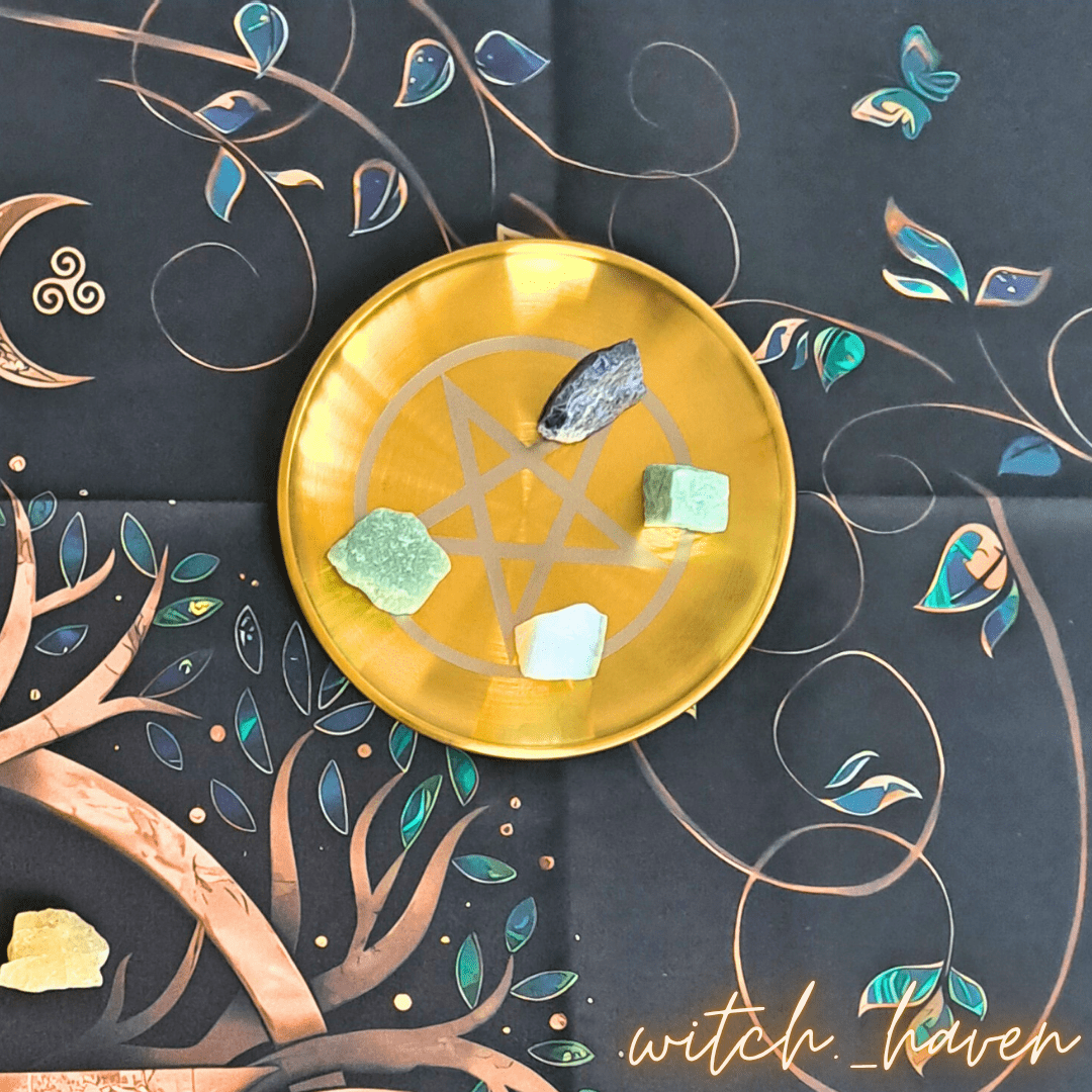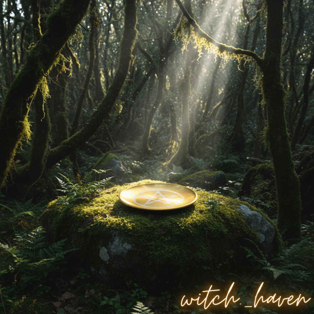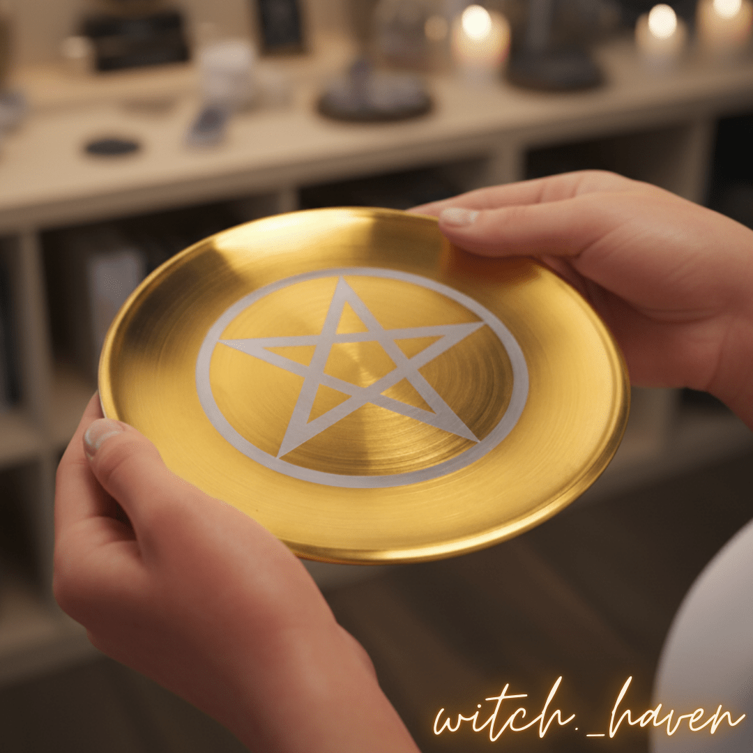 Dieser edle Altarteller mit Pentagramm Gravur ist ein machtvolles Werkzeug für deine magische Praxis. Gefertigt aus vergoldetem Edelstahl, dient er als Anker für deine Rituale und unterstützt dich dabei, deine Energie zu bündeln und deinen Raum zu schützen. Das Pentagramm als Symbol der Elemente bringt Gleichgewicht und Schutz auf deinen Altar. Vor dem Versand räuchere ich deinen Teller persönlich mit weißem Salbei und lade ihn energetisch auf Bergkristallen für dich auf.