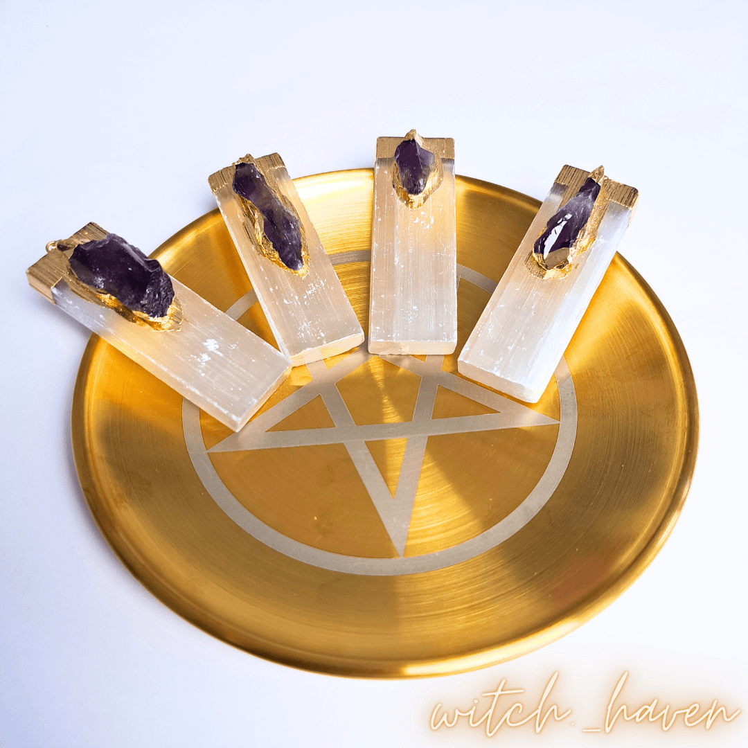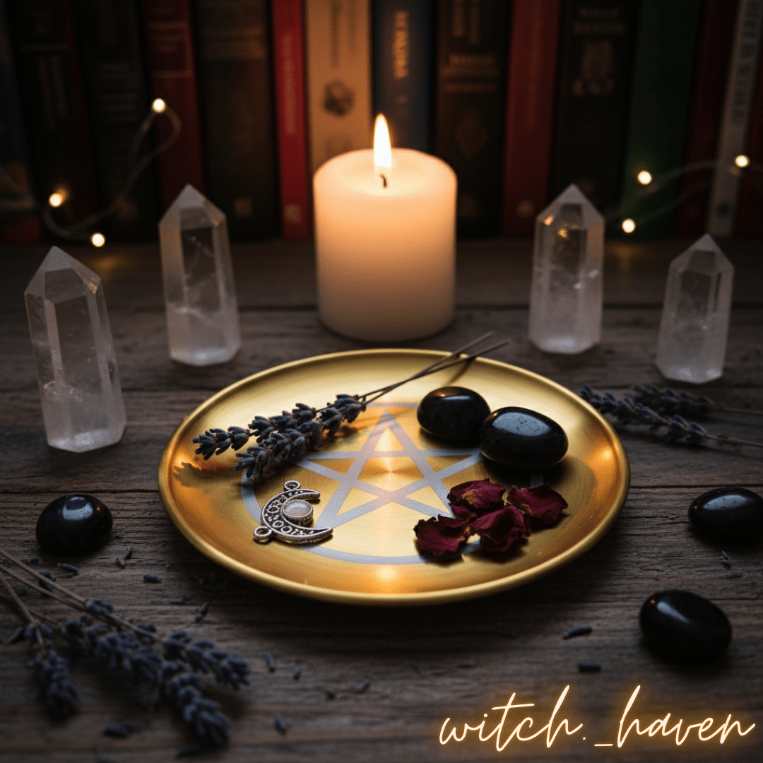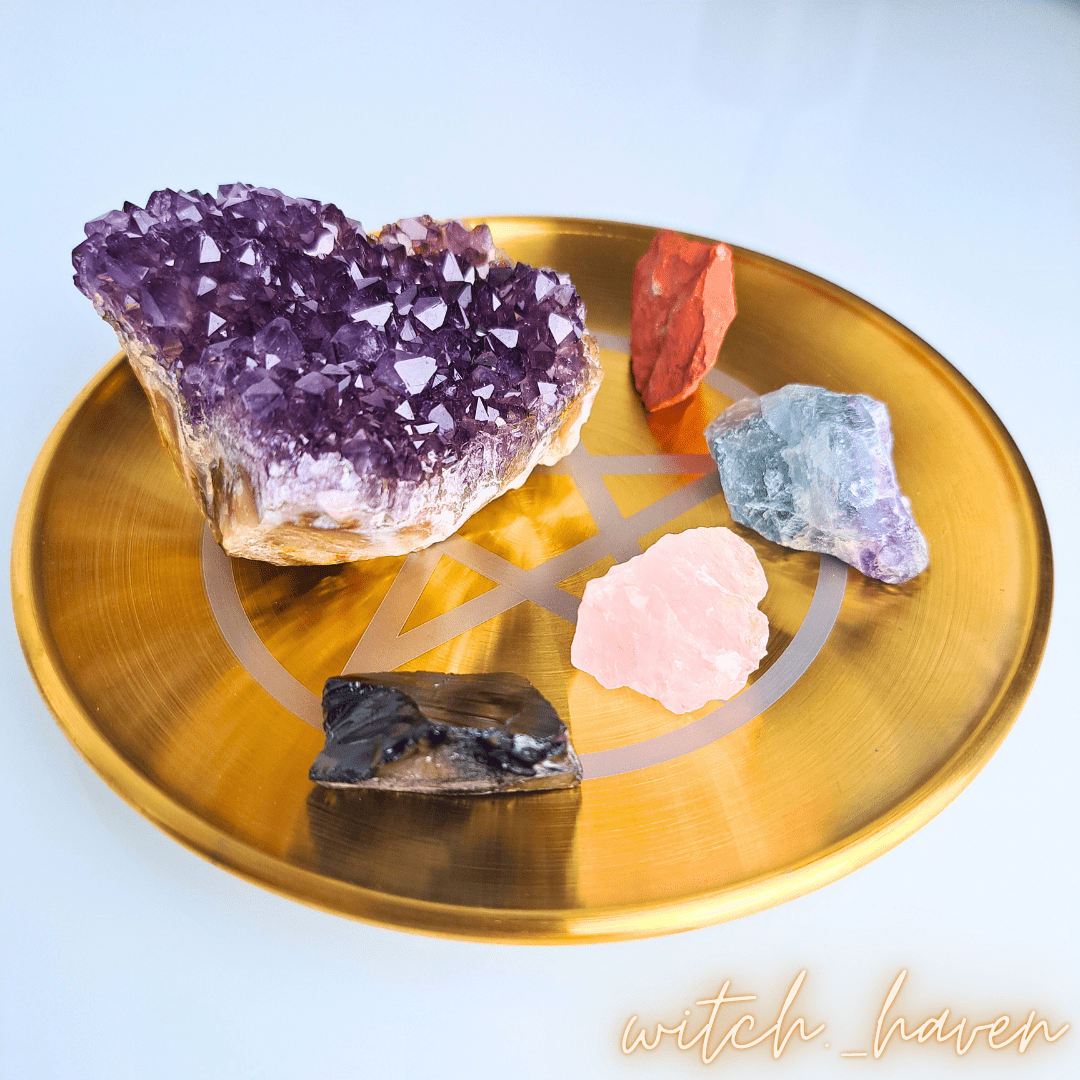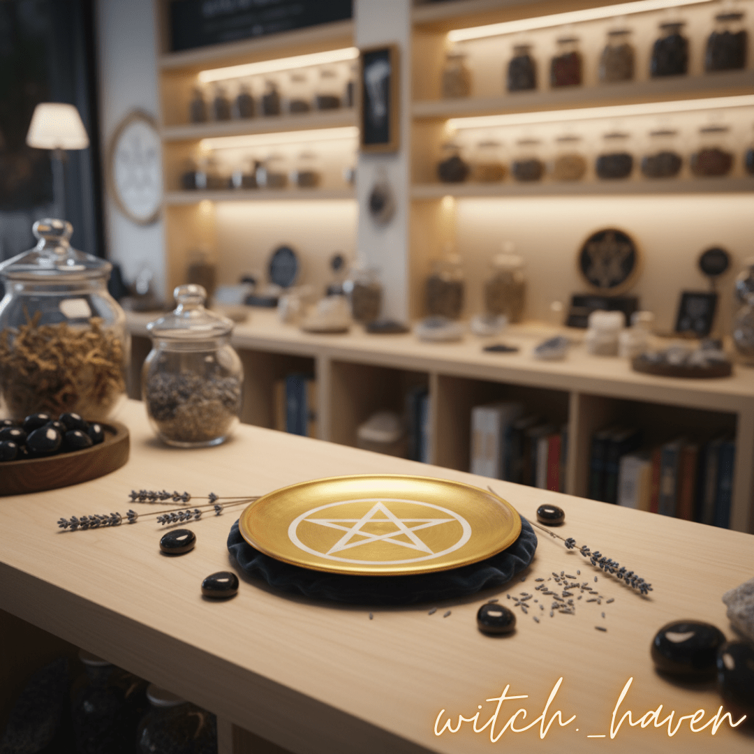 Dieser edle Altarteller mit Pentagramm Gravur ist ein machtvolles Werkzeug für deine magische Praxis. Gefertigt aus vergoldetem Edelstahl, dient er als Anker für deine Rituale und unterstützt dich dabei, deine Energie zu bündeln und deinen Raum zu schützen. Das Pentagramm als Symbol der Elemente bringt Gleichgewicht und Schutz auf deinen Altar. Vor dem Versand räuchere ich deinen Teller persönlich mit weißem Salbei und lade ihn energetisch auf Bergkristallen für dich auf.