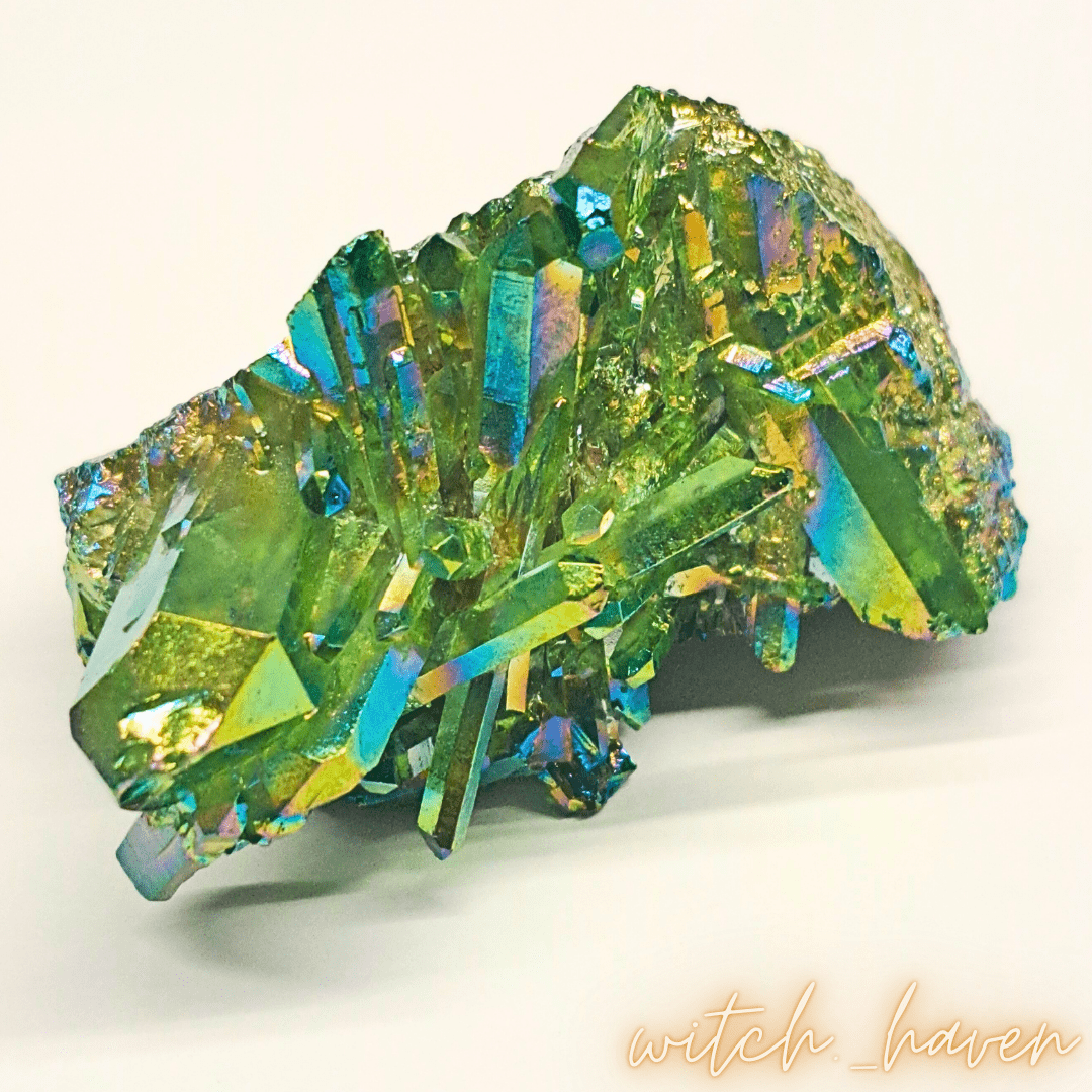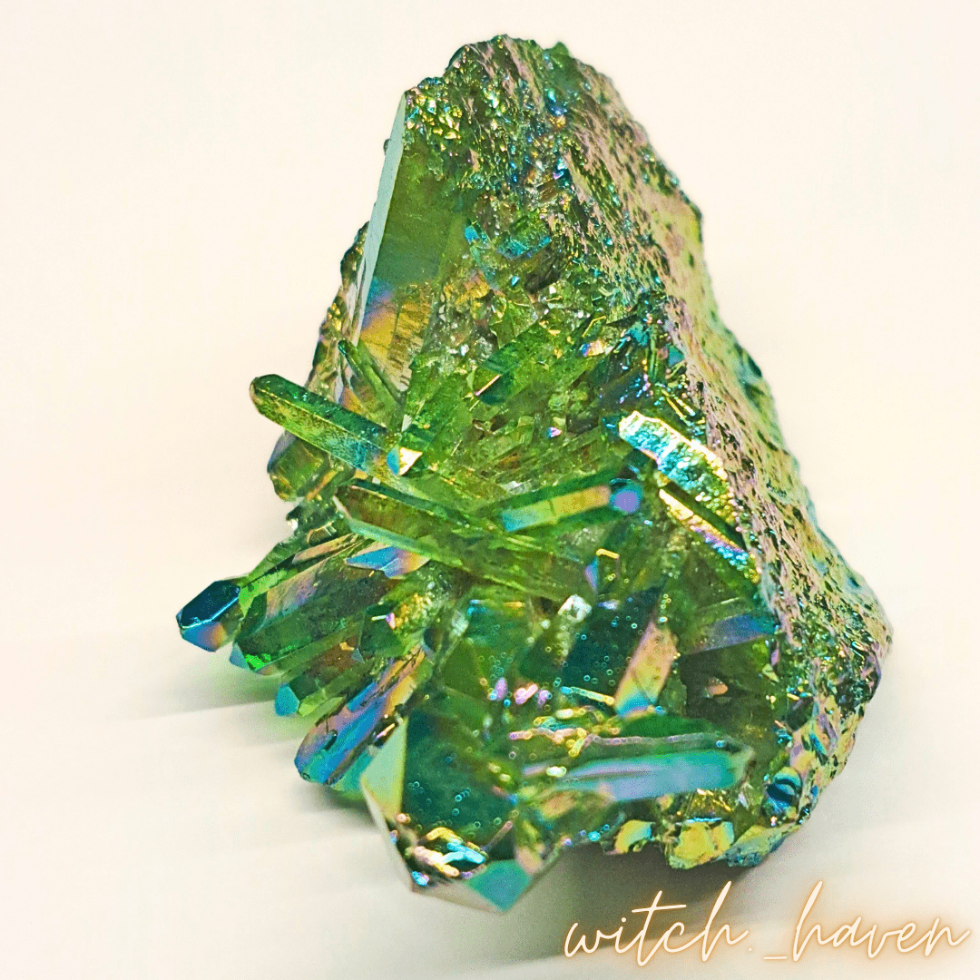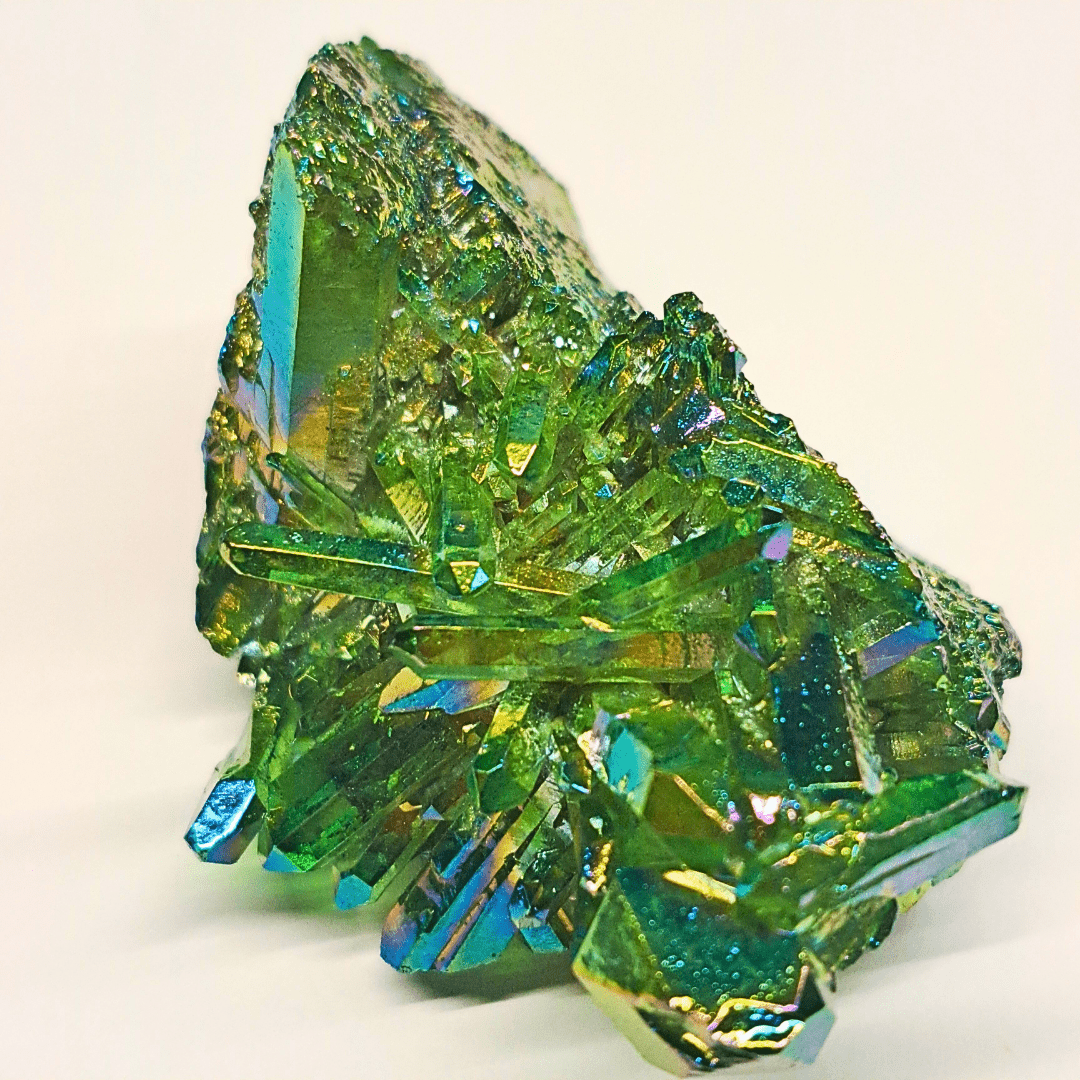Ich biete Dir diesen spektakulären Grünen Aura Quarz Cluster an einen wunderschönen echten Naturkristall von höchster ästhetischer und spiritueller Qualität. Der Kristall besitzt eine klare intensiv leuchtende grüne Oberfläche die bei Lichteinfall wunderschöne Regenbogen Schimmer zeigt. Dieser luxuriöse Kristall gilt als ein starker Träger der Herzensenergie und der Manifestationskraft für Fülle und Erfolg in allen Lebensbereichen.