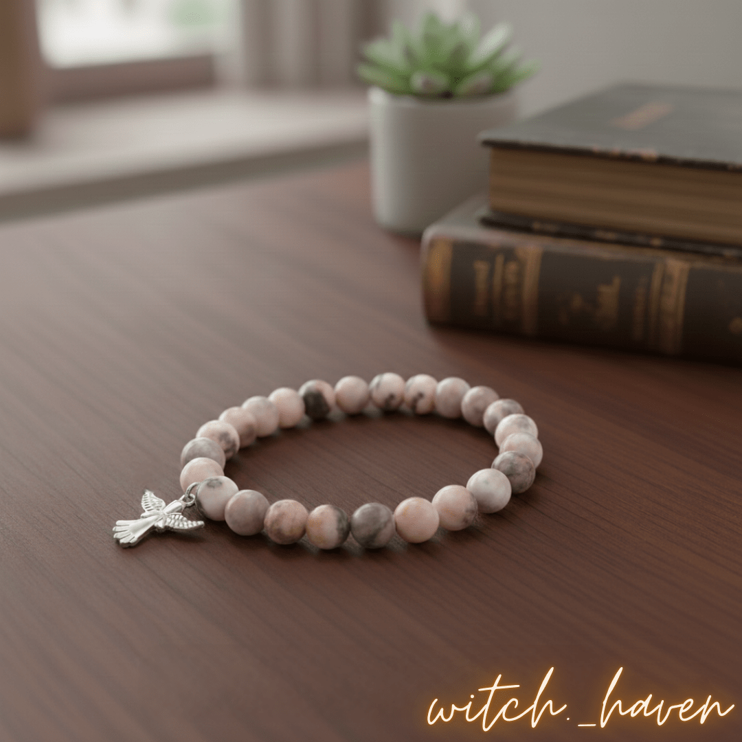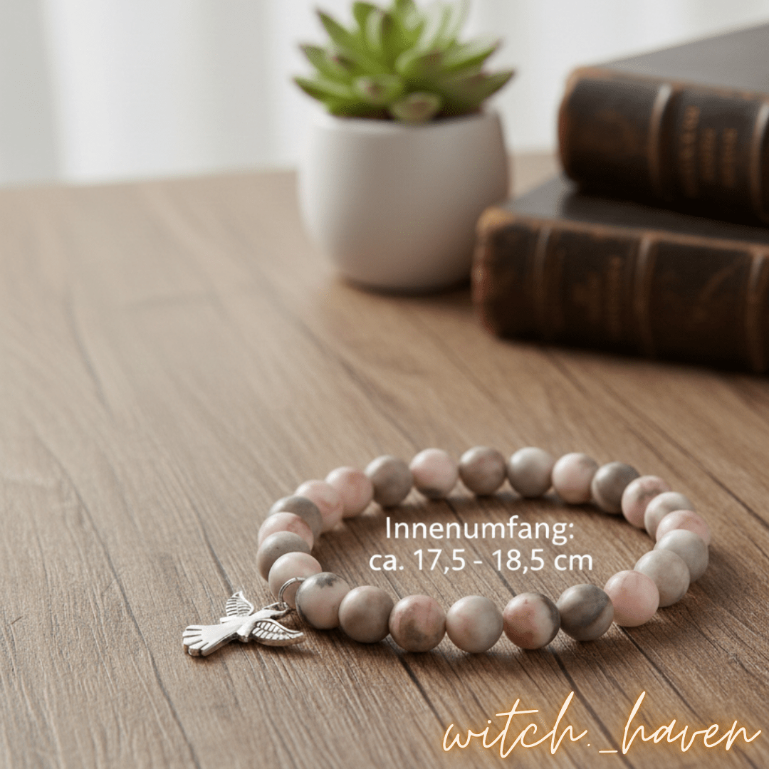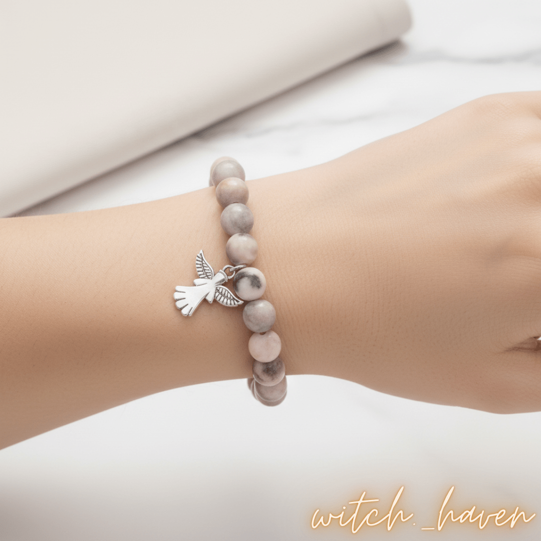 Ich biete Dir dieses zarte Himmelsbegleiter Armband an das ich mit viel Liebe sowie Sorgfalt für Dich selbst von Hand gefertigt habe. Jedes Exemplar besteht aus natürlichen Zebra Jaspis Perlen die ich einzeln auswähle damit Du ein echtes Unikat mit individuellen Maserungen erhältst. Den filigranen Engel Anhänger aus Metall arbeite ich als Symbol des Schutzes sicher für Dich ein um eine harmonische Verbindung zwischen Naturkraft und spiritueller Begleitung zu schaffen.