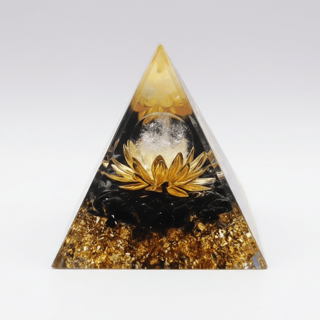 Die Pyramidenform ist ein heiliger geometrischer Körper der seit Jahrtausenden dafür bekannt ist kosmische Energien zu bündeln und zu verstärken. Der Obsidian dient dabei als starker Schutzstein der energetischen Klärung und Erdung. Im Zentrum der Pyramide strahlt die goldene Lotusblume das Symbol für Reinheit Erleuchtung und spirituelles Wachstum. Diese Kombination macht die Lotus Obsidian Pyramide zu einem exklusiven Ritualobjekt das die Frequenz Deines Raumes harmonisiert und Dich bei der Manifestation von Fülle unterstützt.