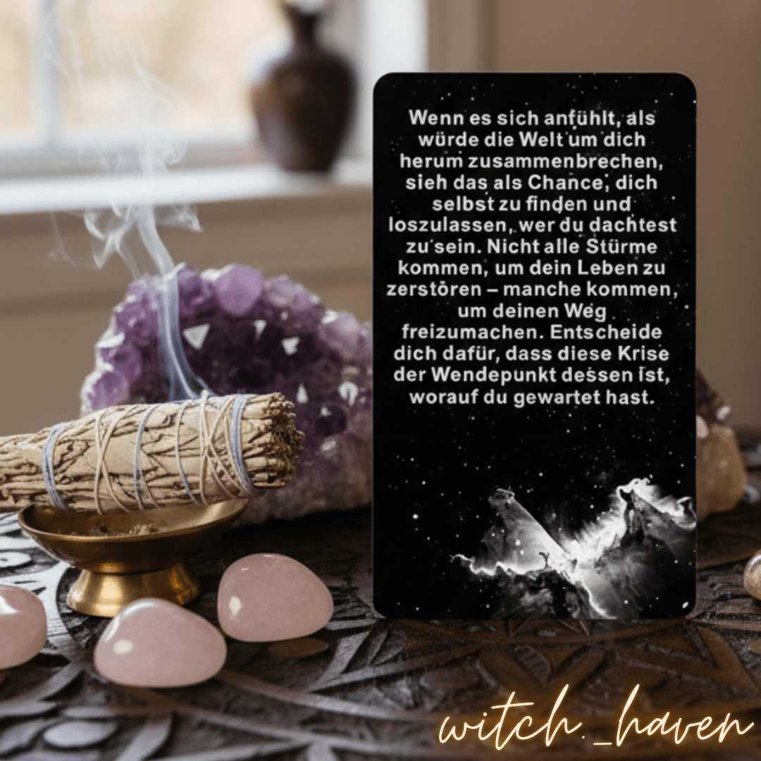 - Tagesfokus: Ziehe morgens eine Karte und lass die Botschaft auf Dich wirken. Sie zeigt Dir oft den nächsten liebevollen Schritt auf Deinem Weg.
