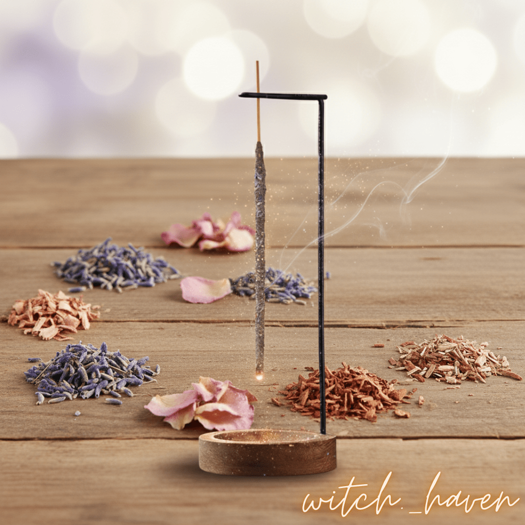 Damit du deinen neuen Räucherständer sofort einweihen kannst, schenke ich dir zwei handgemachte Weihrauchstäbchen in den Duftrichtungen Lavendel, Rose und Zeder. Diese Stäbchen wurden von mir sorgfältig gerollt und enthalten sichtbare Blütenblätter. Sie bieten eine lange Brenndauer und einen natürlichen, wohltuenden Kräuterduft.